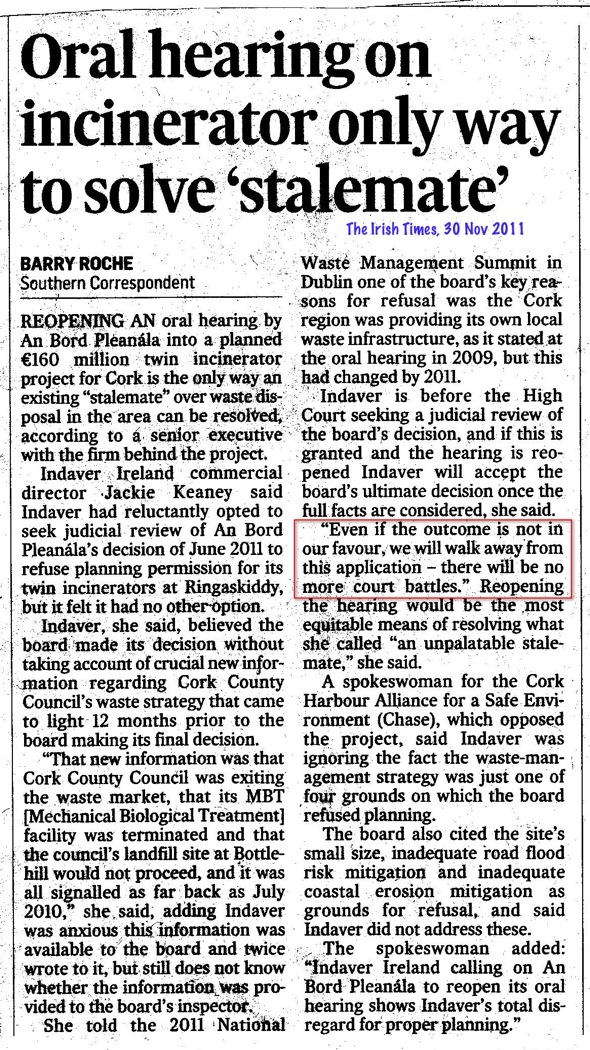 CHASE PRESS RELEASE – 10 September 2012 INDAVER U-TURN WITH NEW ‘PRE-APPLICATION CONSULTATIONS’ A BREACH OF TRUST Indaver have surprised local residents with revelations that they are once again in ‘pre-application consultations’ with An Bord Pleanala for their Ringaskiddy site, contrary to assurances given by Indaver that whatever the final outcome of the 2008 application, the company would accept it as final. These intentions were repeated in The Irish Times of 30 November, 2011 by Indaver Ireland Commercial Director, Jackie Keaney, who referring to Indavers High Court challenge to An Bord Plenala’s refusal of planning permission said “Even if the outcome is not in our favour, we will walk away from this application – there will be no more court battles.” CHASE Chairperson Mary O’Leary challenged Indavers integrity saying “An Bord Pleanala rejected their application on sound planning grounds. Indavers latest U-turn highlights the real issues communities have in standing up to big business and their unlimited war chest. This is a prime example of arrogance and bullying by a private company who will go against all sound planning policy to get their own way in the name of profit. Indaver clearly has no regard for either due process or the local community. How can we trust a company that says one thing, then does the opposite with such ease.” Indavers High Court challenge to An Bord Pleanala’s